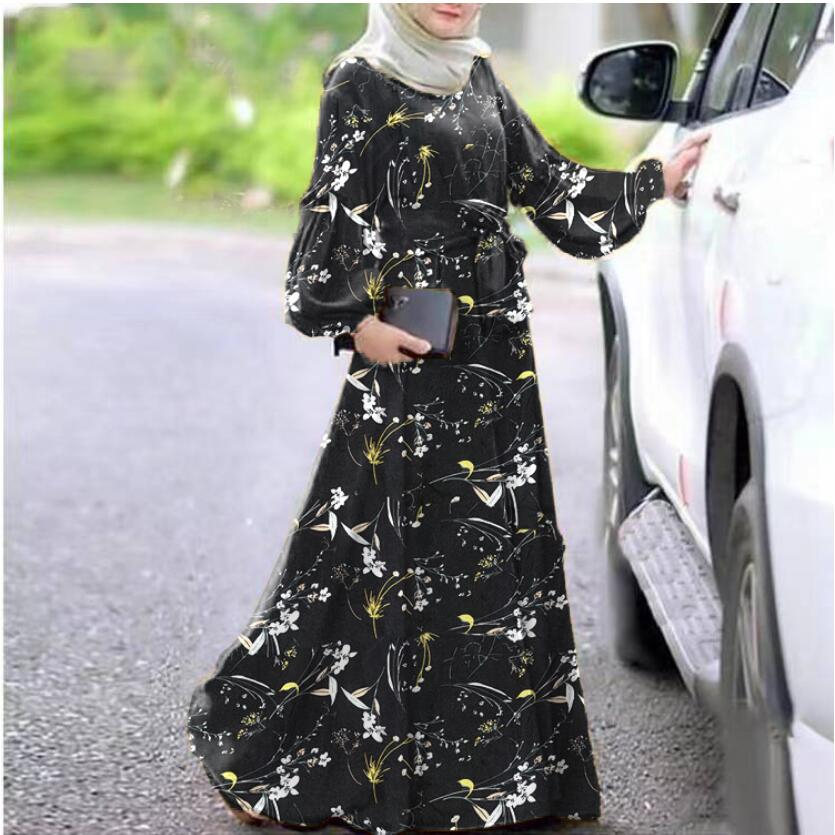 ZANZEA Women Vintage Lace-up Solid Puff Sleeve O Neck Muslim Long Dress
