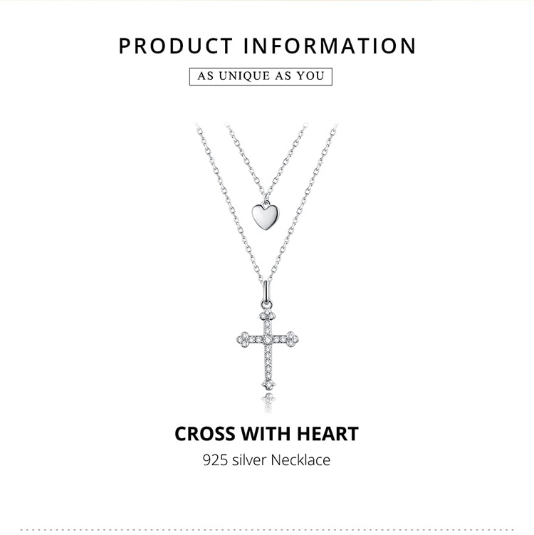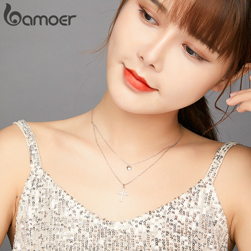 bamoer Sterling Silver 925 Cross with Heart Plated platinum CZ Pendant Necklace for Women Chain Necklaces Jewelry BSN197