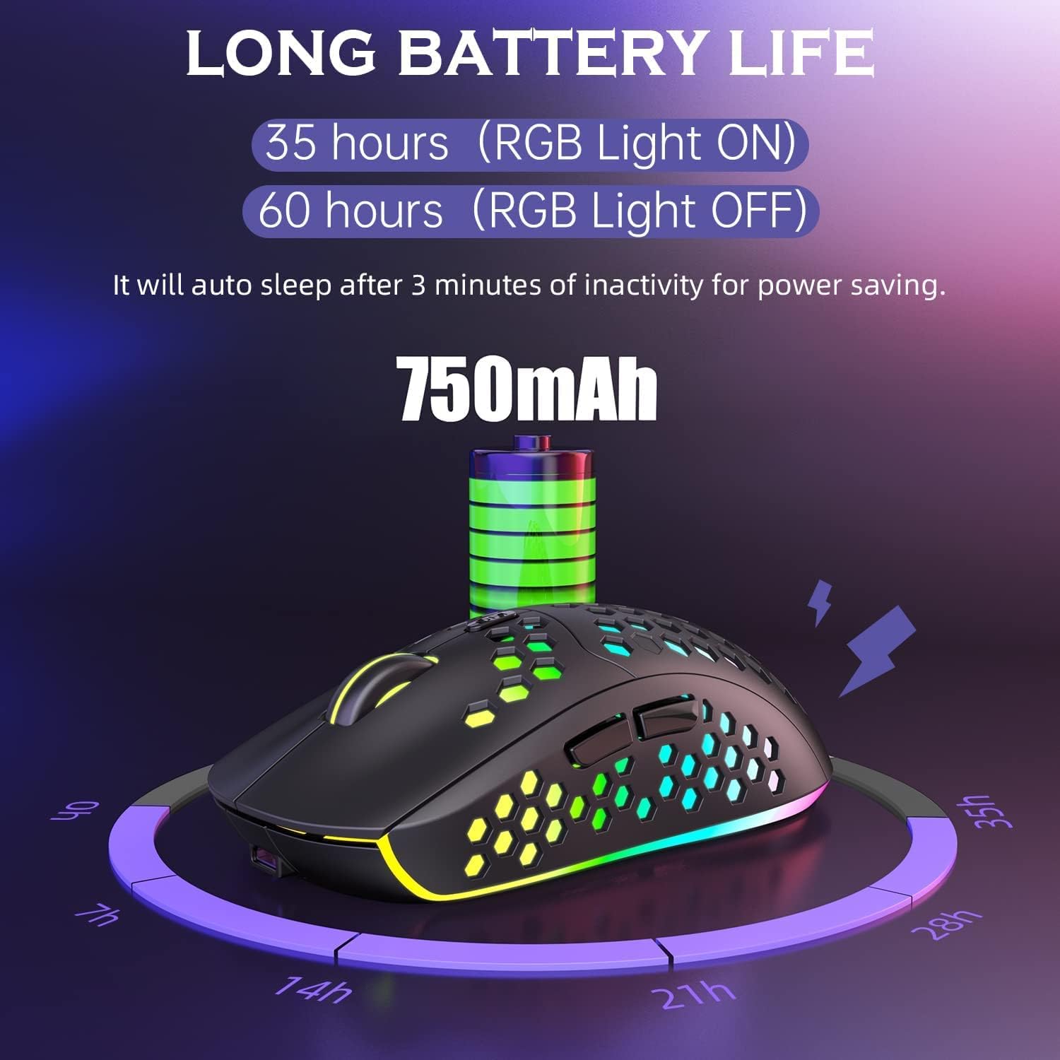 【2.4G Wireless & Rechargeable Mouse】USB connection, plug, and play, no driver required. It will work well in 10 meters. The rechargeable gaming mouse has built-in a 750 mAh battery. You can use it for an average of about 1.5 hours a day for 2-3 weeks. Please charge it 2 hours for one time(The mouse comes with 59 inches charging cable)