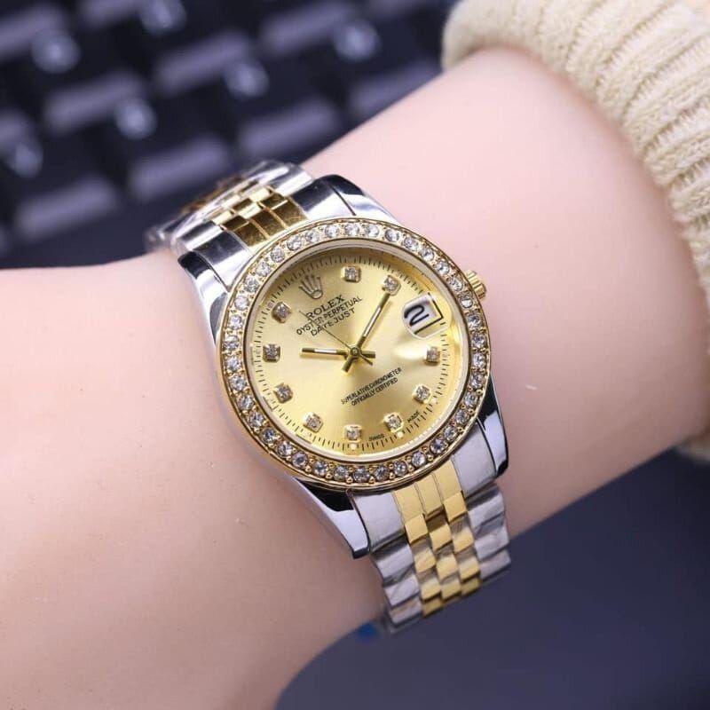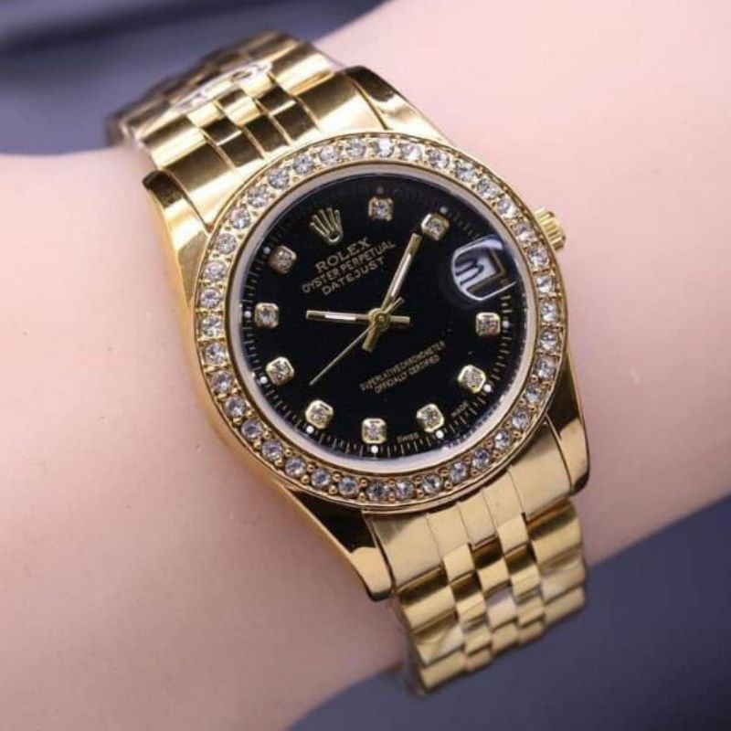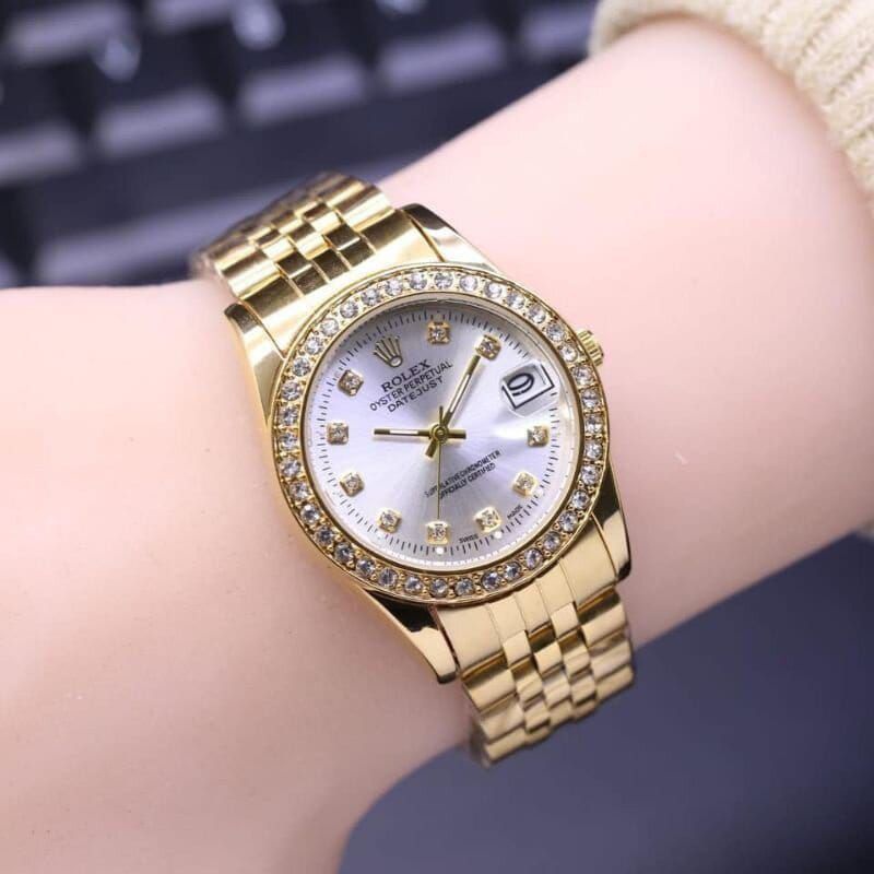 Rolex diamond stone jam tangan perempuan quartz analog no use battery stainless steel watches with free box