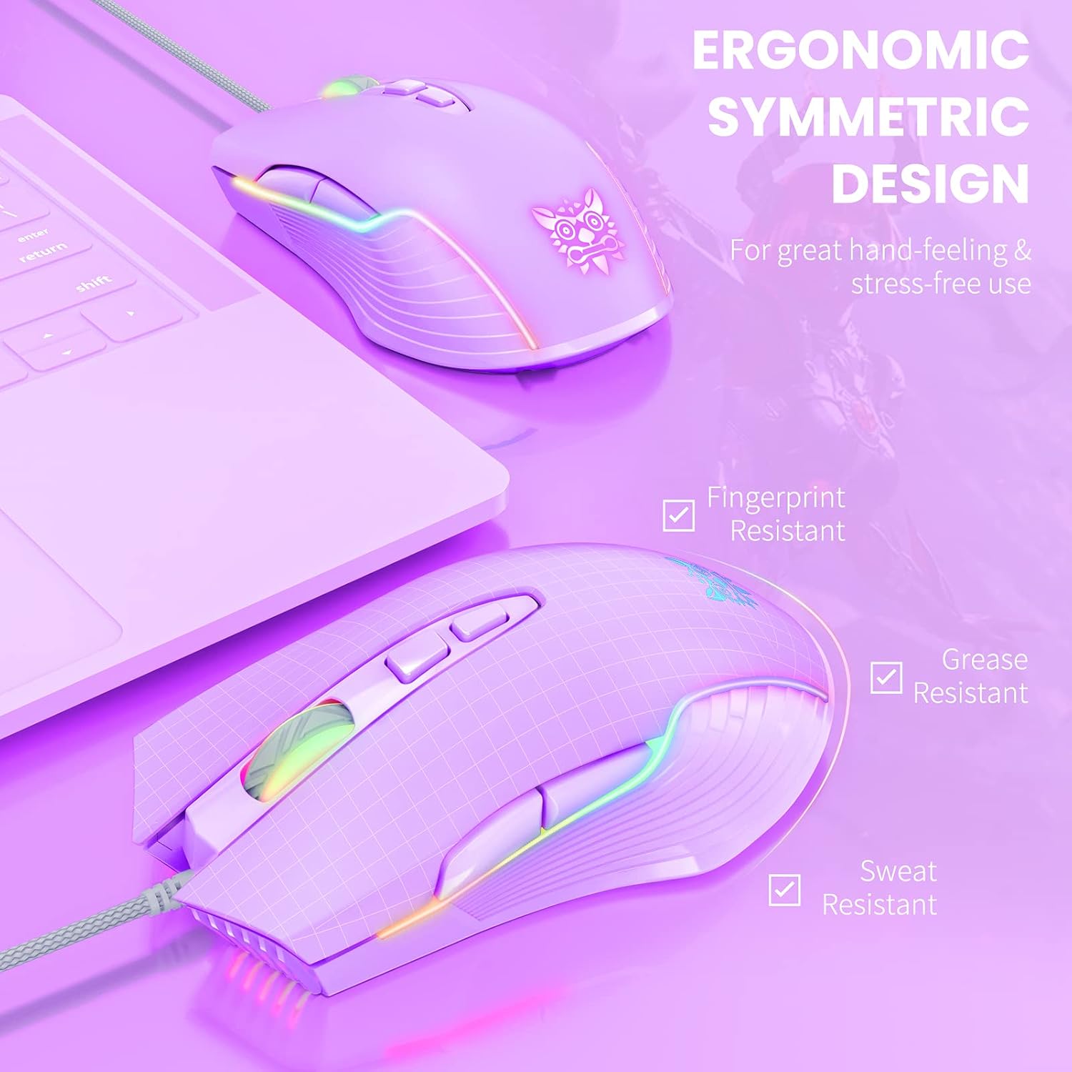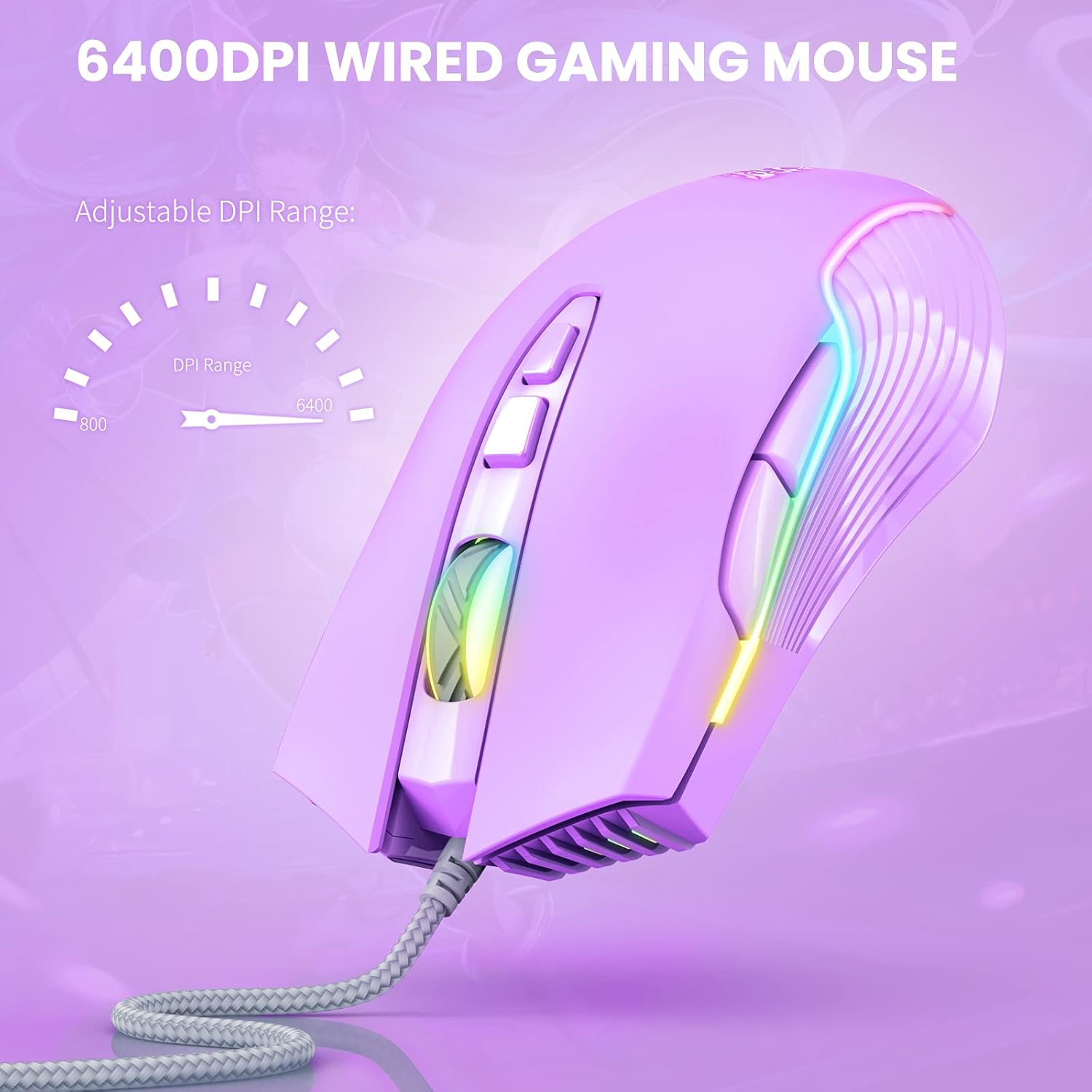 RGB Lighting Colors: Muti-color lights provide you fancy gaming environment and highlight your game atmosphere. The lilac gaming mouse offers you total personalization for your gaming computer and laptop